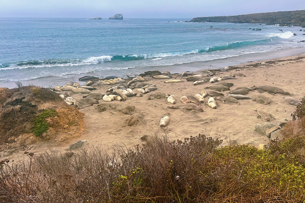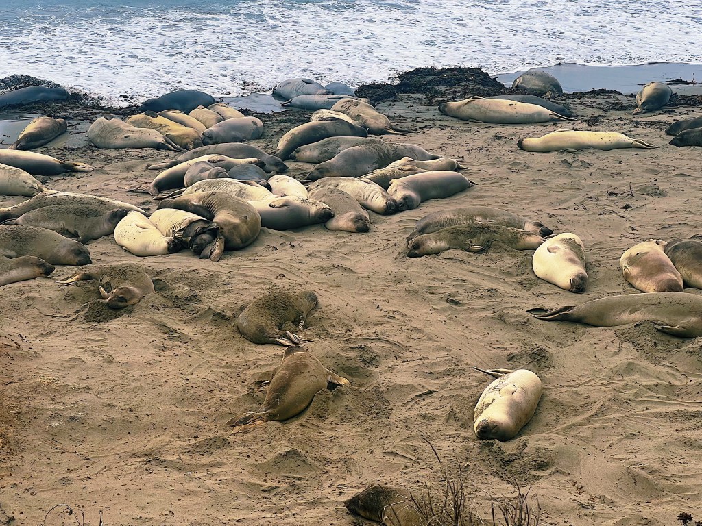 Our last stop of the day was at the Piedras Blancas elephant seal rookery. A friendly volunteer shared some fascinating information about the seals. Elephant seals spend most of their life at sea but twice a year they come out onto the rookery (a place where animals breed and give birth). For the couple of months they are on land they are very social but at sea they lead mostly solitary lives. The females head out into the middle of the Pacific where they feed on small fish and squid. They can dive as deep as over 5,000 feet (1,700 meters) and can stay under water for up to two hours. The males head up toward Alaska, staying closer to shore, eating rays and crabs and octupuses and other bottom feeders.