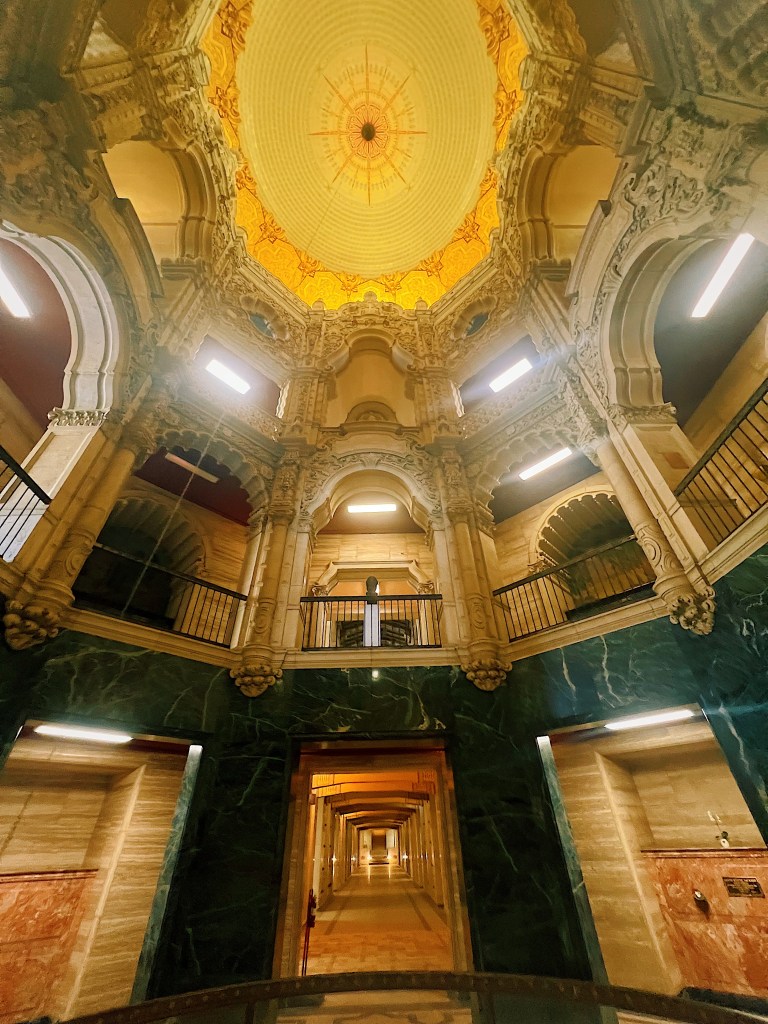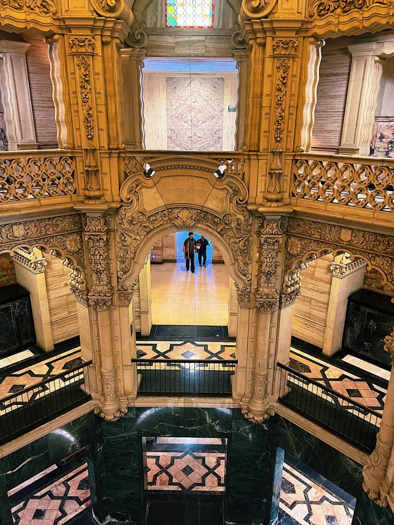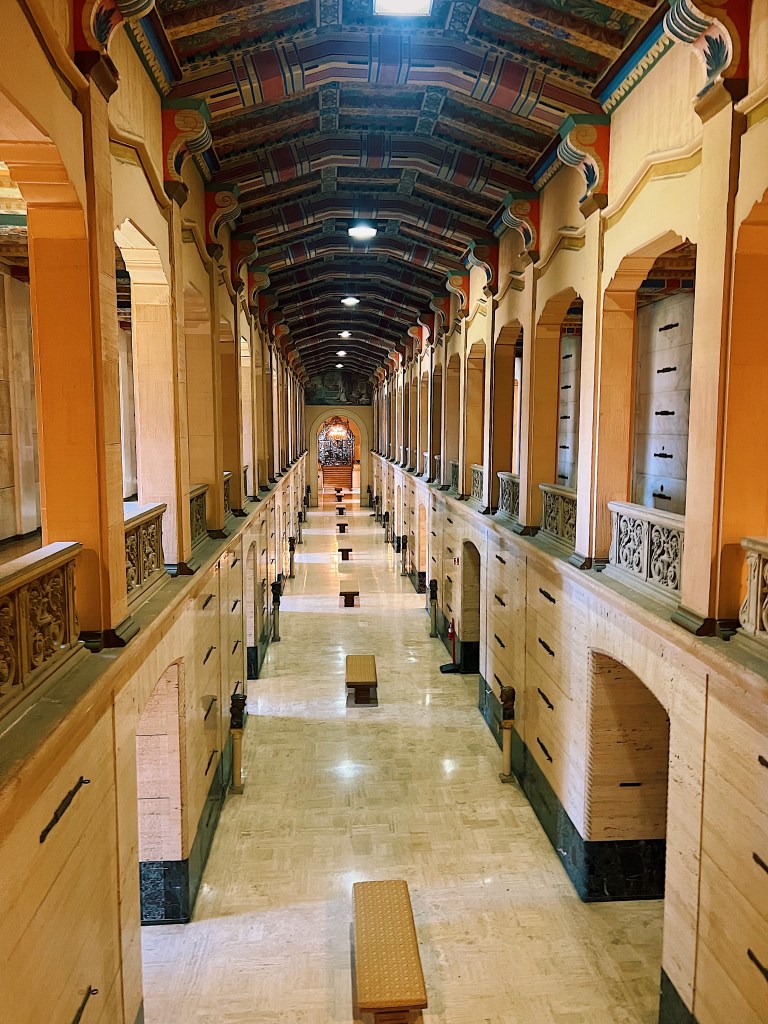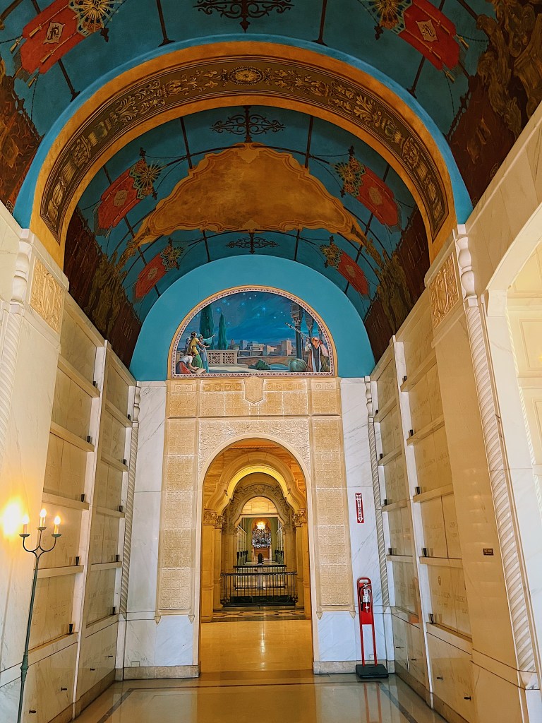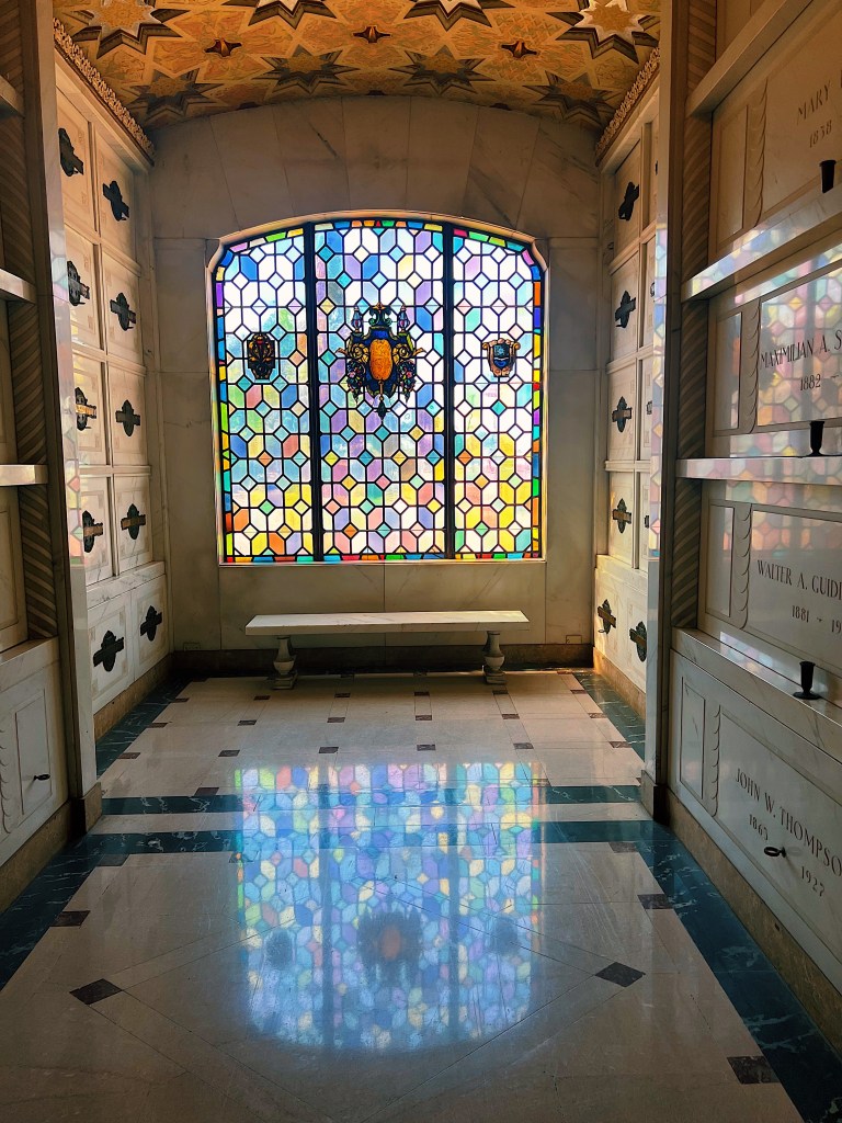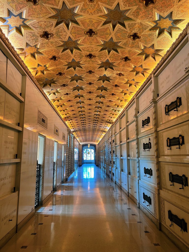 Our walk took us to the Forest Lawn Memorial Park cemetery which contains a beautiful mausoleum that was built in 1924-25. It is a very Spanish style beautiful building. We struck up conversation with a passer-by who goes for regular walks around the mausoleum and surround cemetery. Allan acted as our guide, showing up points of interest. It was a little eerie walking down endless marble corridors surrounded on all sides by dead people.