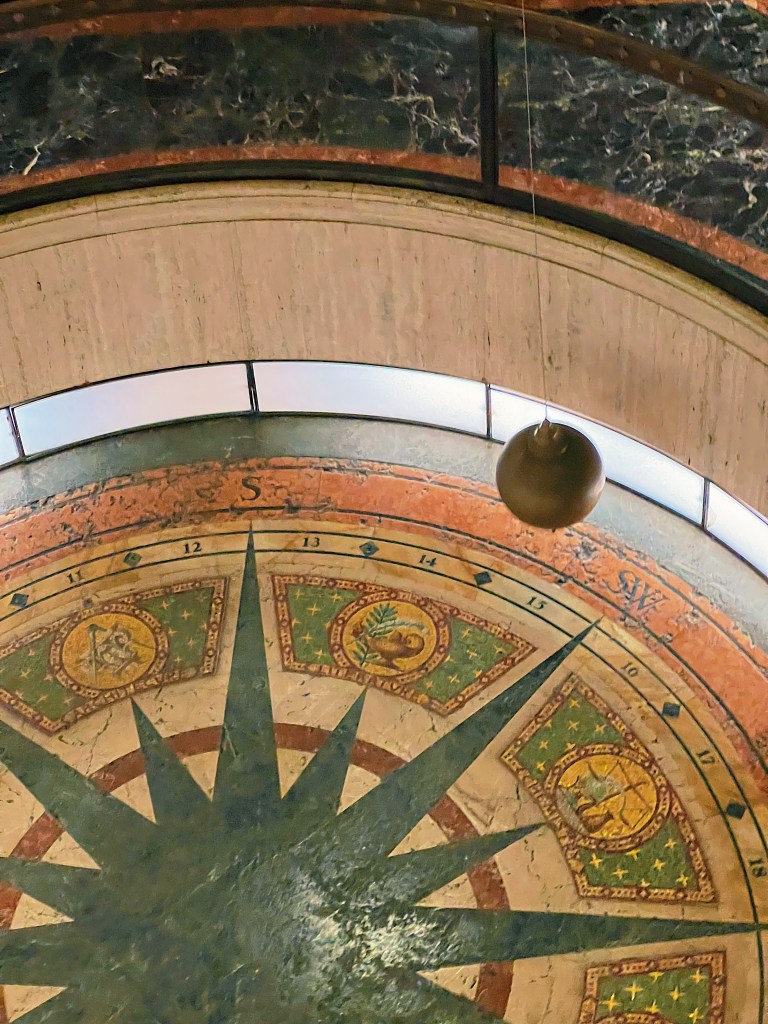 Among the dead is a Foucault pendulum. Named after its inventor, the French physicist, Leon Foucault, the pendulum was conceived to demonstrate the earth’s rotation. By hanging a long and heavy pendulum from a high roof above a circular area, the plane of the oscillation appears to change as the earth rotates. In other words, although the pendulum is only swinging in one direction, the earth is rotating underneath it, making it look as though the pendulum is swinging in different directions as the day progresses. So when we were there in the early afternoon, the pendulum was swinging toward hour 15 of the 24 hour clock. Supposedly, if we came back a couple of hours later the pendulum would be swinging toward hour 17 of the clock, despite the fact that the pendulum would be swinging on the same arc.