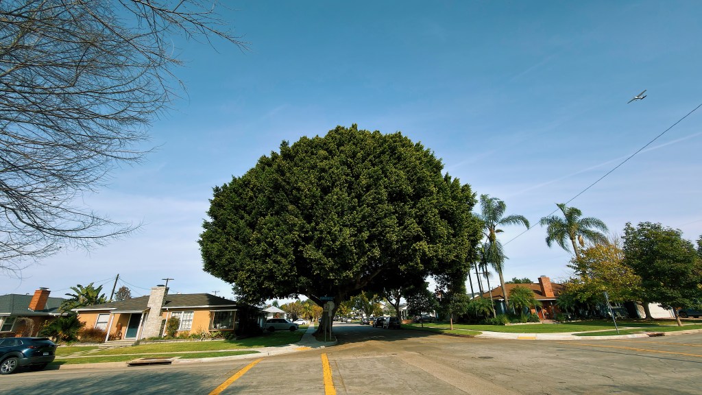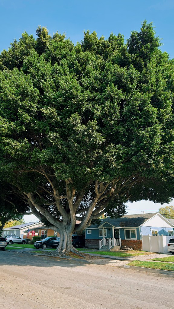 Dotted throughout the neighborhood are massive, dense Ficus microcarpa (Indian laurel fig or Chinese banyan) trees.