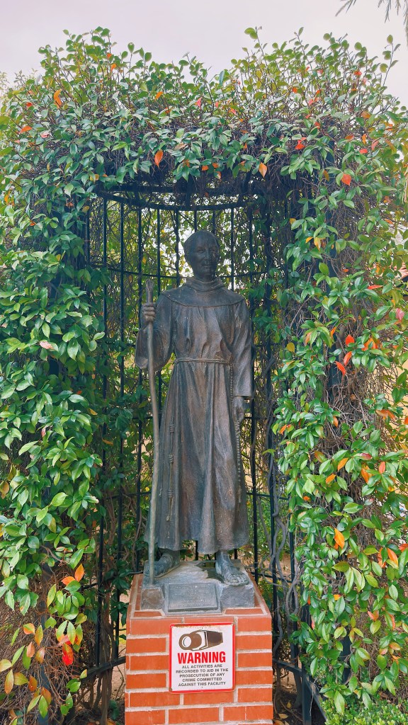 Junipero Serra was a Franciscan monk who established eight of the Californian historic missions. His name pops up frequently as you travel through California, on everything from streets to schools. He was canonized (declared a saint) by Pope Francis in Washington DC on September 23, 2015 in the first canonization held on United States soil. The canonization was not without controversy, as opponents pointed out that the indigenous people had suffered greatly under the mission system that he had created. Many of the converts were not free to leave after baptism and were forced to work at the missions. Further, the missions suppressed the traditional culture and religion of the local people. The mission system also undoubtedly contributed to the catastrophic collapse of the indigenous population, as they were brought together at the missions where they were at much greater danger of catching and dying from the European diseases to which they had no immunity. The child death rates in particular were extremely high. As a result, many Serra statues have been toppled or removed in California which probably explains why this statue of Serra comes with a warning.