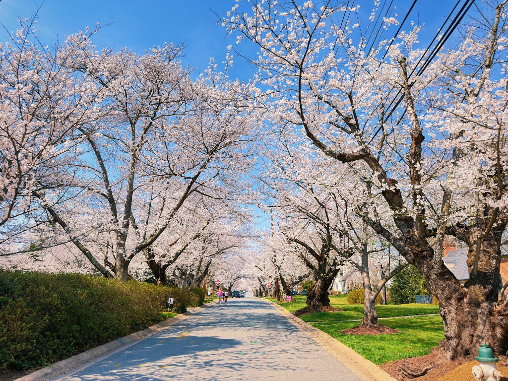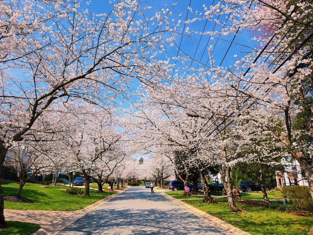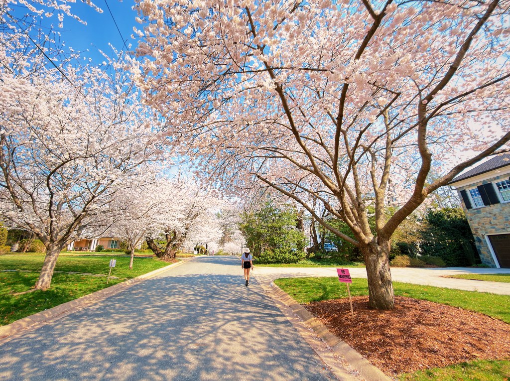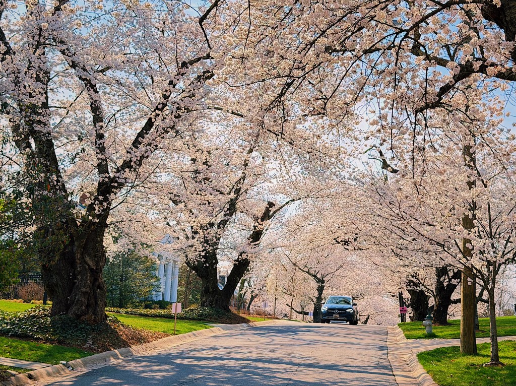 It is cherry blossom season here in Washington DC and crowds are gathering downtown to stroll under the trees that rim the tidal basin. Less well known as a spot to get your cherry blossom fill is the Maryland suburb of Kenwood. Over 1,000 cherry trees were planted in Kenwood in the 1920s and 1930s by the developers before they even built the first homes. While not quite as chaotic as downtown, the beautiful neighborhood of large stately homes still attracts sizable crowds. A windy or rainy day can quickly bring an end to the bloom, so with rain in the forecast we headed over to Kenwood during what was being advertised as the blossoms peak day.