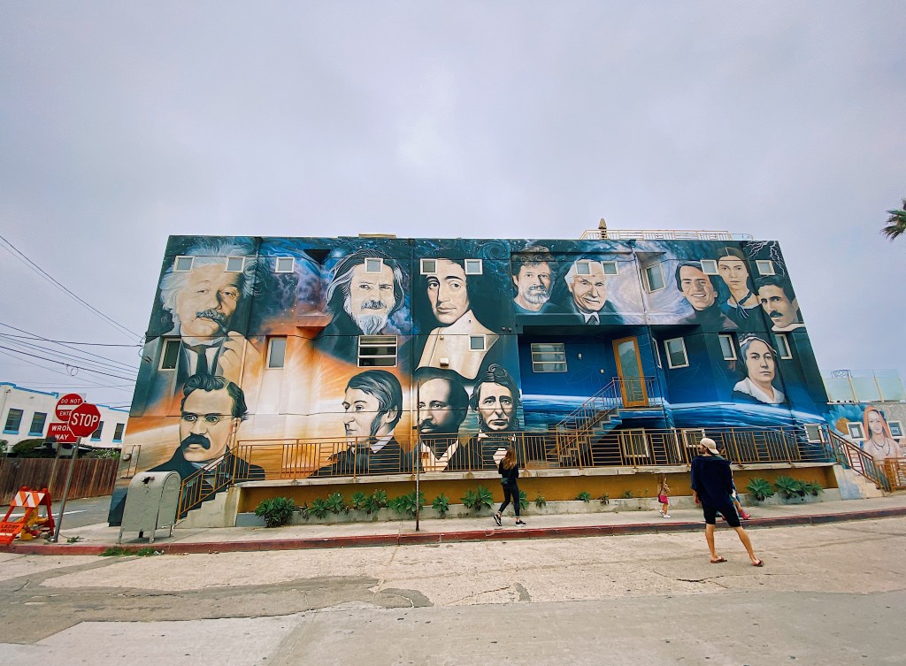 It’s just a couple of blocks from the canals to the beachfront, so we once again made our way down to the free-for-all that is Venice Beach. We passed this large mural, titled ‘Luminaries of Pantheism’. According to the dictionary, pantheism is a doctrine which identifies God with the universe, or regards the universe as a manifestation of God. It’s also a worship that admits or tolerates all gods. So here’s the second contest of the day. Name the luminaries. Once again the answers will be at the end of the post.