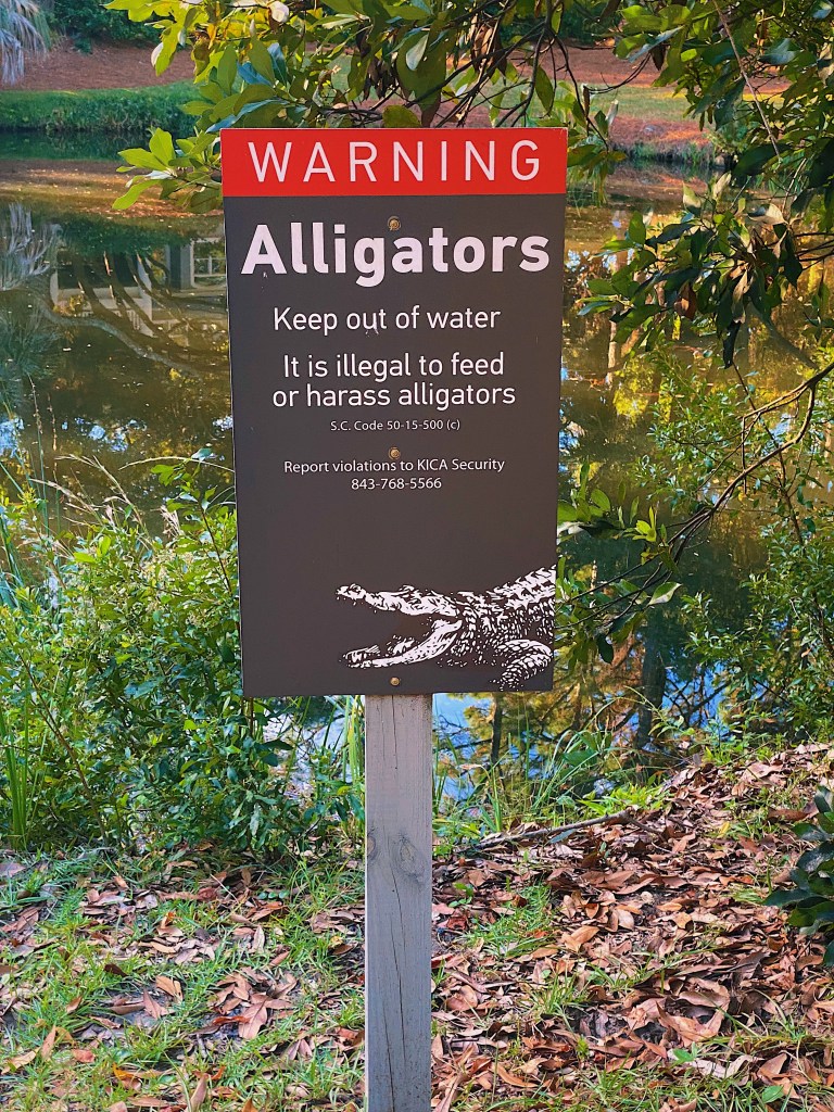 Dotted throughout the island are scores, if not hundreds, of ponds and each one seems to have a resident alligator or two. Beside each of the ponds is a sign pointing out that it is illegal to feed or harass the alligators. It surprised us that such a warning was necessary. Harassing alligators seems to be self-evidently inadvisable. We also wondered whether it is illegal to feed the gators if they happen to be feeding on you.