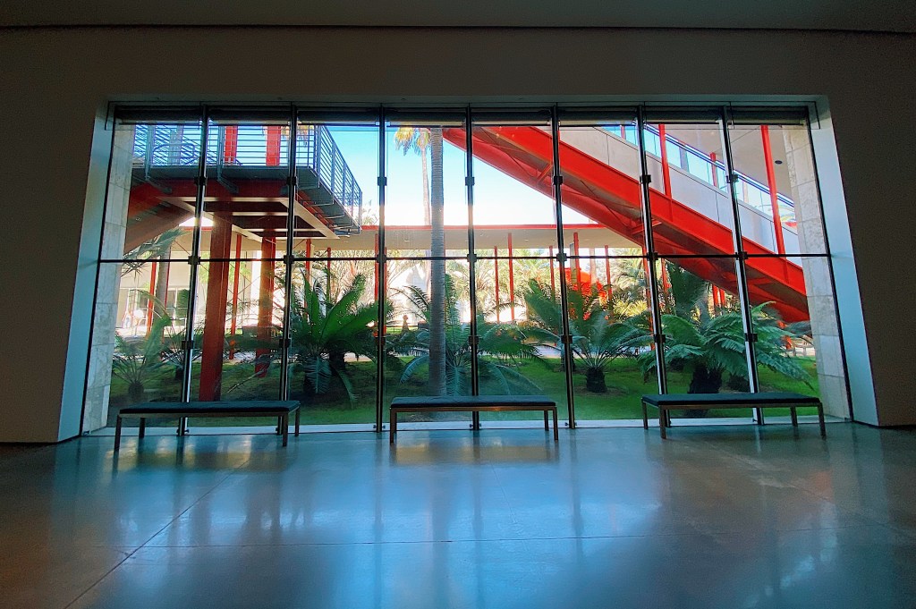 The different museum buildings are connected by covered walkways, held up by bright red steel girders.